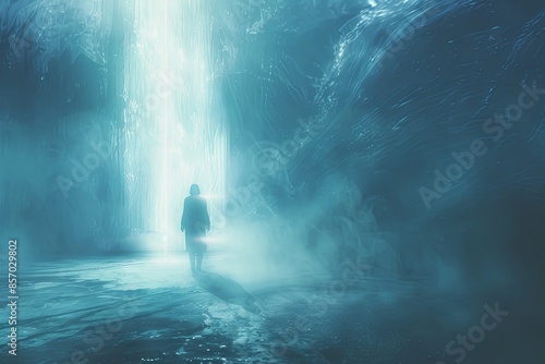 A lone person stands in a dimly lit cave, facing a bright, ethereal portal. Generative AI