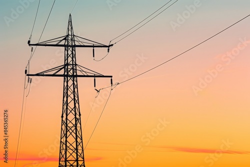 A lone power tower stands tall against a vibrant sunset sky, its silhouette outlined by the warm hues of the fading light.