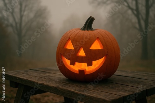 A lone pumpkin glows with a warm light amidst the foggy forest, casting an eerie yet festive ambiance