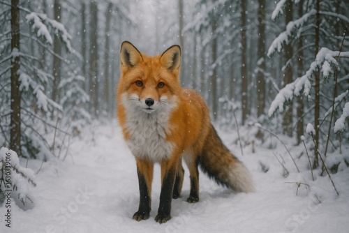 A lone red fox stands alert in a winter wonderland, its gaze fixed on the camera amidst snow-covered trees
