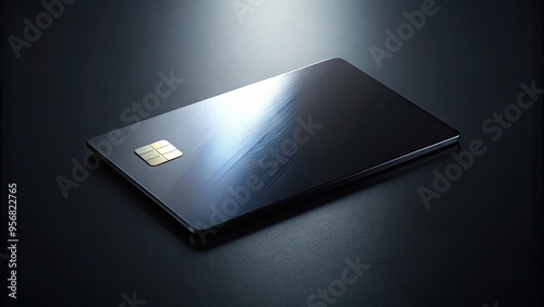 A lone, shiny credit card lies on a sleek, dark background, its metallic sheen illuminating a solitary, modern payment method devoid of human interaction.