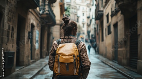 travel, adventure, backpack, explorer, journey, wanderlust, street, urban, city, alleyway, cobbled, europa, architecture, building, historic, destination, explore, discover, sightseeing, tour tourism, vacation, holiday, woman, female, young, adult, walking, backview, anonymous, perspective, distant, city landscape, atmosphere, mood, scenic, beautiful, photogenic, photo, picture, image, graphic, art, design