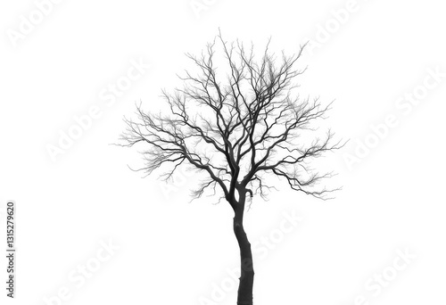 A lone tree, branches reaching skyward, stark against a pure white backdrop, wood, picture
