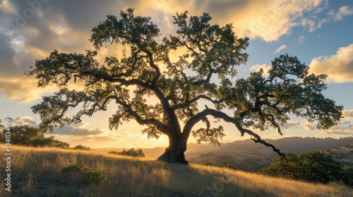 A lone tree with sprawling branches standing on a gentle hill, bathed in golden sunset light. The tree's silhouette is striking against a softly blurred solid-color background, emphasizing its intri