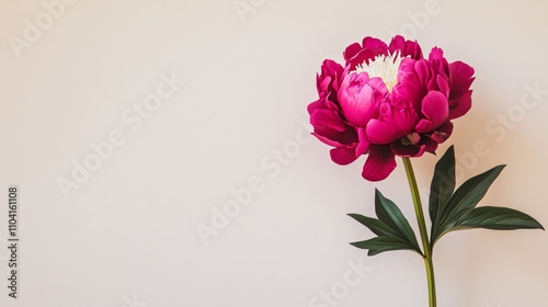 lone, vibrant, magenta, peony, isolated, light, taupe, background, closeup, shot, minimalist, style, photo, description, white, space, center, page, text, high, quality, image, bright, hue, intricate, flower petals, clean, serene