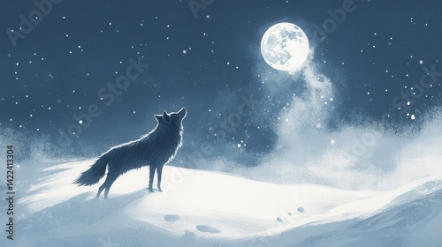 wolf, moon, night, snow, star, sky, howling, winter, dark, forest, wildlife, nature, landscape, animal, celestial, full, solitary, snowy, cold, blue, white, space, illuminated, light, shadow, footprint, serene, majestic, wild, fur, wilderness, glow, scene, distance, atmosphere, cosmic, isolated, peaceful, beautiful, artistic, painting, illustration, tranquil, fantasy, aethereal, quiet, evening
