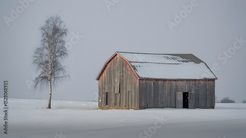 A lonely barn and tree stand in a snow-covered landscape under a gray sky, creating a serene, somewhat melancholic atmosphere.