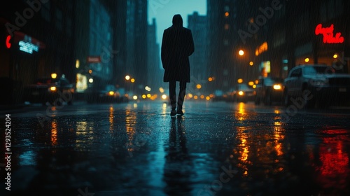 A lonely city street at night, illuminated by dim, eerie lights, with rain falling softly and creating a quiet, melancholic atmosphere, evoking solitude and mystery on the deserted urban streets.