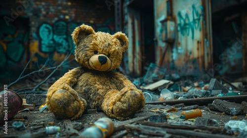 A lonely teddy bear sits amidst rubbles and debris in an abandoned urban setting, surrounded by graffiti and decay. The scene conveys a sense of neglect and lost childhood.