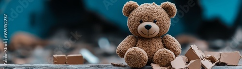 A lonely teddy bear sits amidst scattered blocks, evoking feelings of nostalgia and lost childhood innocence.