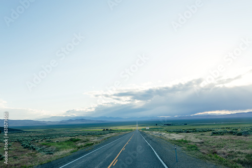 A long asphalted straight road stretches far into the horizon, on which blue mountains can be seen. The rays of the sun break through the large clouds over the road. blue sky before sun