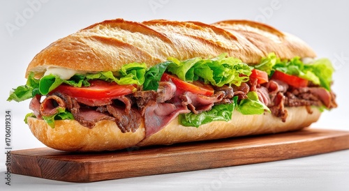 sandwich, roast, beef, baguette, lettuce, tomatoes, mayo, fresh, food, delicious, epicure, lunch, dinner, tasty, healthy, protein, meat, vegetarian, ingredient, bread, wooden, board, serving, appetising, prepared, classic, cookery, simple, fast, easy, picnic, portable, filling, flavorful, deliciously, substantial, freshly, made, crispy, bun, savoury, delightful, satisfying, wholesome, alimentary, indulgent