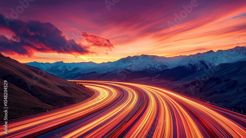 A long exposure cinematic photograph of a highway with mountains at sunset