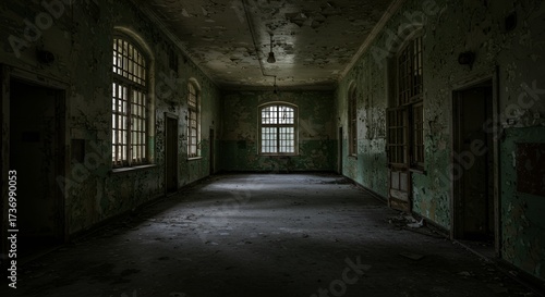 hallway, abandoned, decay, interior, architecture, building, peeling paint, grunge, dilapidated, ruin, empty, old, vintage, historical, aged, distressed, worn, texture, pattern, wall, window, arch, light, shadow, perspective, vanishing point, symmetric, eerie, creepy, skittish, haunted, ghostly, forgotten, desolate, melancholy, atmospheric, moody, grim, gloomy, derelict, neglected, patina, weathered, deterioration, exploration, institutional, asylum