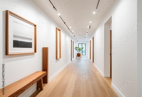 A long hallway with pictures hanging on the wall.