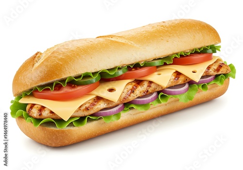 A long sandwich with grilled chicken cheese tomatoes lettuce and red onions on a white background