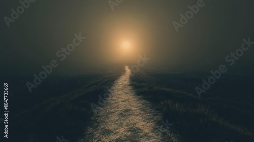 A long, straight path leads towards a bright light in the distance, shrouded in fog and mystery.