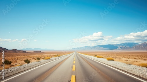 A long, straight road cuts through the vast desert landscape, disappearing into the horizon under a bright blue sky.