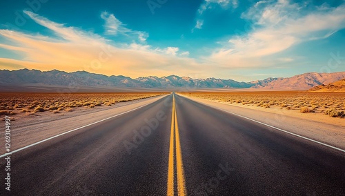 A long straight road stretches across a vast arid landscape under a dramatic sky with mountains in the distance conveying a sense of journey adventure and the open road