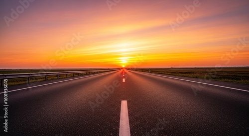 A long, straight road stretching into the distance with a vibrant sunset in the background.