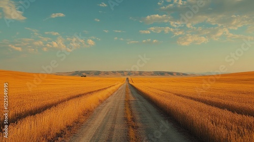A long, straight road through an expansive wheat field, the golden crops waving in the breeze.