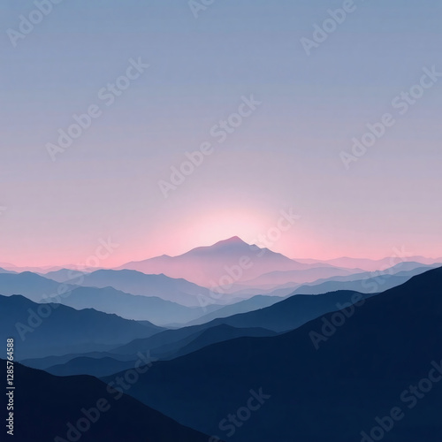 A long-exposure photograph capturing an ethereal spiritual vibe, depicting layered mountains in cool gradient colors under a pastel sky, with smooth minimalist shapes, a light aura.