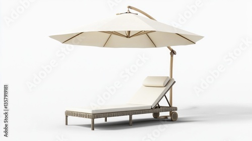 A lounge chair with an umbrella on a white background
