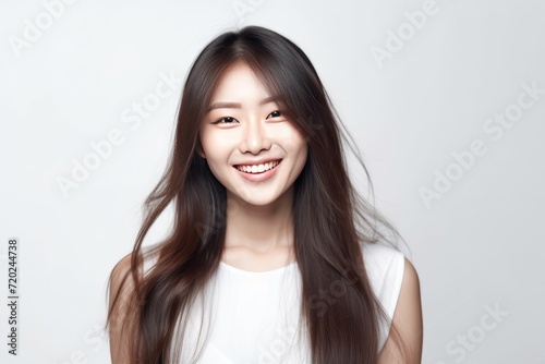 a lovely Asian girl with flawless skin and flowing long hair, set against a clean white background for a crisp and timeless aesthetic. Generative AI.