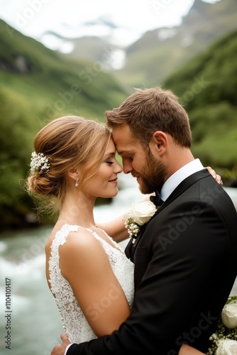 couple, river, scenic, romance, nature, mountain, romantic, greenery, loving, love, hugs, wedding, outdoors, calmness, happiness, joy, oneness, togetherness, affectionate, emotional, scenic view, tenderness, white dress, suit, bride, groom, photo, connection, landscape, summer, beautiful, stunning, peaceful, natural, intimate, portrait, timeless, enchanting, bond, serene