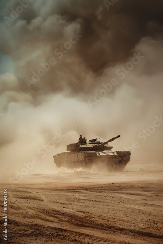 A low-angle shot of an Military tank M1 Abrams charging across a vast desert landscape