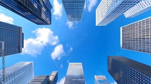 A low-angle view with lens flare captures modern skyscrapers in a business district against a blue sky, representing the concept of business and financial towers. : Stock
