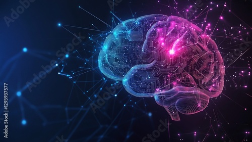 A luminous digital brain sculpted from translucent glass, intertwined with vivid neon energy threads, creating a futuristic and vibrant visual concept.