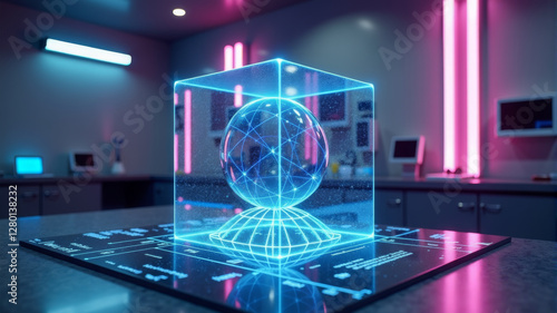 futuristic, style, cube, three-dimensional, hologram, technology, future, innovation, artificial intelligence, network, datum, information, interface, design, concept, abstraction, aglow, blue, modern, desktop, office, space, background, icon, symbol, line, structure, semitransparent, creativity, visualisation, graphic, computer graphic, high technology, cyberspace, progress, development, science fiction, scientific, research, experiment, laboratory
