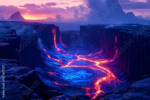 A luminous volcanic ridge drowning in molten flows of crimson and blue, surrounded by jagged cliffs glowing faintly.
