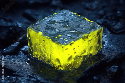 A luminous yellow ice cube, glistening with water droplets, rests on a dark, wet surface.