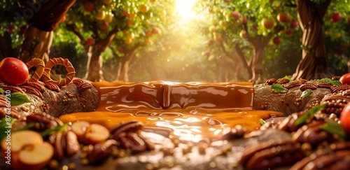 A luscious caramel river flows through a forest of apple trees, surrounded by pecans, pretzels, and apple slices.