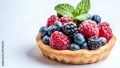 A luscious mini tart with fresh berries and mint. Dessert on white background