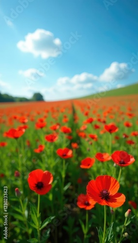 A lush carpet of Red Turk's cap flowers in full bloom under a bright blue sky, grass, field