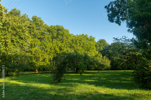 park, tree, grass, lawn, green, leaf, sun, sunny, day, shadow, nature, summer, outdoors, landscape, scenic, beautiful, relax, peaceful, tranquil, serene, open, space, blue, sky, bright, foliage, forest, vegetation, grove, wood
