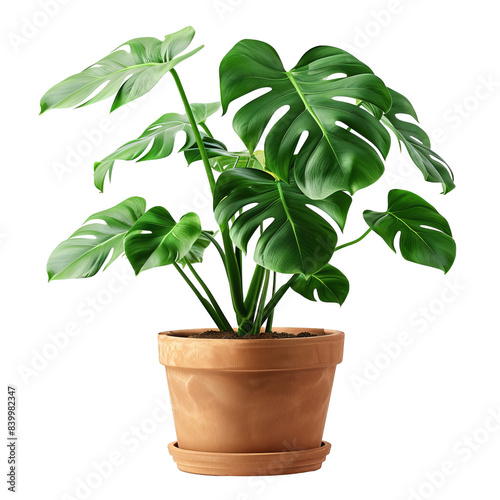 A lush green Monstera plant in a terracotta pot, isolated on a black background. The leaves are large and textured, showcasing the plant's natural beauty.