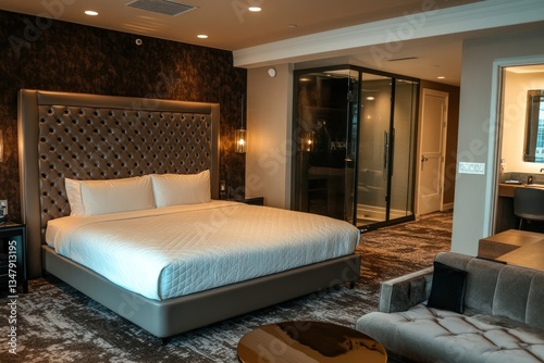 bedchamber, hotel, suite, interior, design, modern, elegant, bed, headboard, pillow, blanket, quilt, furniture, room, wall, texture, pattern, light, lamp, nightstand, floor, carpet, couch, seating, table, mirror, sink, shower, glasses, door, frame, window, view, roomy, comfortable, luxury, upscale, dark, neutral, warm, relaxing, stay, lifestyle, decor, detail, style
