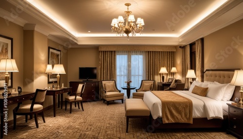 A luxurious hotel room featuring elegant decor and a cozy ambiance, with plush furnishings and soft lighting.
