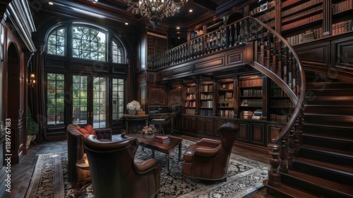 A luxurious library featuring dark wood, a spiral staircase, and comfortable seating for reading and relaxation.