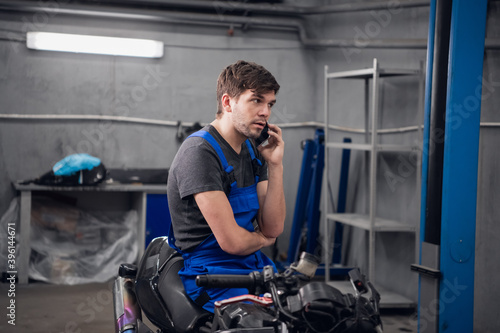 man, mobile, owner, search, craft, adult, phone call, talking, job, young, work, vehicle, hand, mechanic, bike, people, repair, transportation, manager, contraption, vintage, occupation, technician, cyberspace, biker, professional, motorbike, equipment, service, male, store, client, hair, transport, garage, men at work, concentration, shop, business, smartphone, style, phone, lifestyle, count, motorcycle, workshop, technology, photogenic