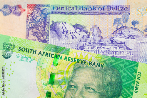 A macro image of a shiny, green 10 rand bill from South Africa paired up with a colorful two dollar bill from Belize. Shot close up in macro.