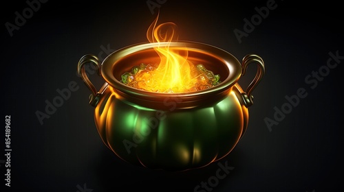 A magical cauldron with a glowing green liquid and flames coming out of it. The cauldron is made of metal and has two handles.