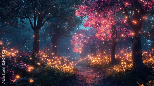 A magical forest with glowing flowers and vibrant trees, creating an enchanting atmosphere in a serene nature setting.