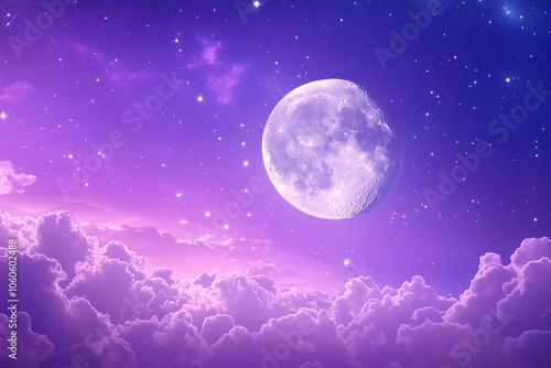 A magical night scene featuring a full moon hanging in a purple sky, with faint clouds and shimmering stars dotting the background
