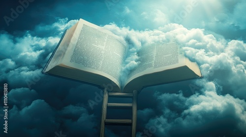 A magical open book with a ladder leading into the clouds, symbolizing imagination and possibilities