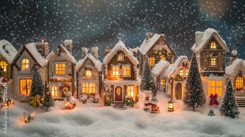 A magical snowy night in a Christmas village, with glowing windows, holiday decor, and twinkling lights